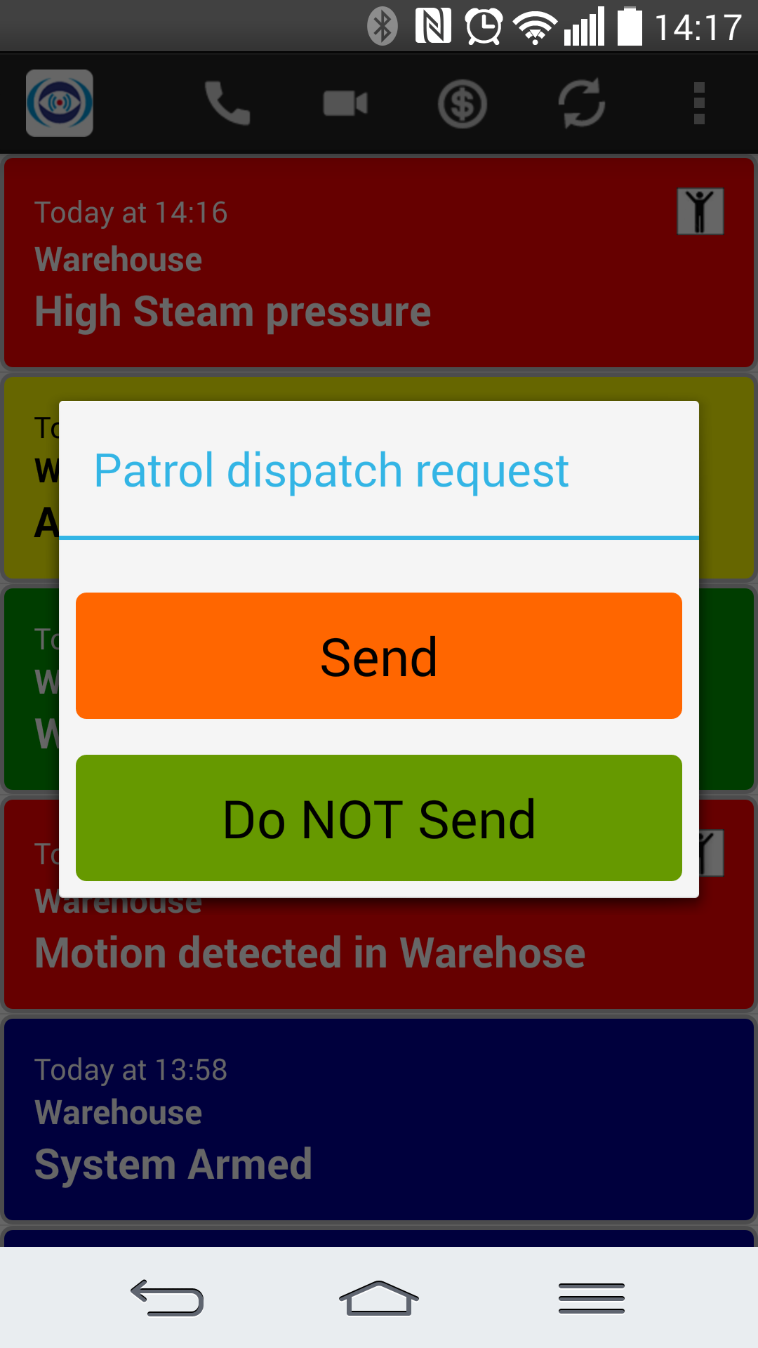- Client Feedback: Tapping on a received Event with Alarm priority will open a Dialog Box providing the Client with an option to send a Feedback Notification to the Central Station via the GPRS Server (e.g. a request to send a manned Patrol to investigate the alarm source).